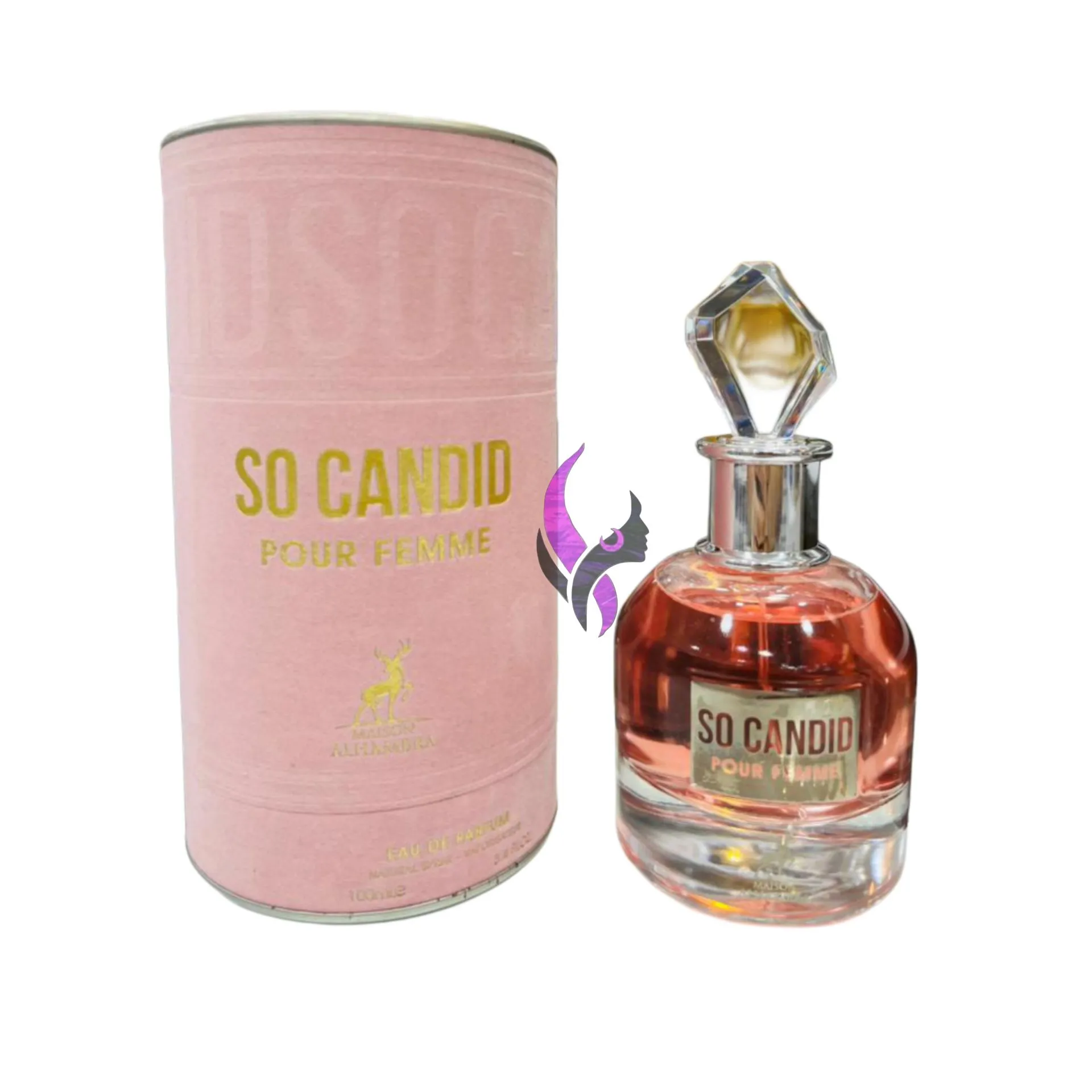 رایحه ادکلن So Candid Pour Femme Alhambra ترکیبی متعادل از نتهای گلی، میوهای و چوبی است که شخصیتی لطیف و زنانه به آن میبخشد.